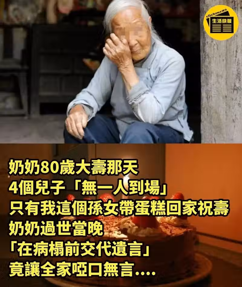 奶奶80歲大壽那天,4個兒子「無一人到場」,只有我這個孫女「帶蛋糕回家祝壽」,奶奶過世當晚「在病榻前交代遺言」,竟讓全家啞口無言....
