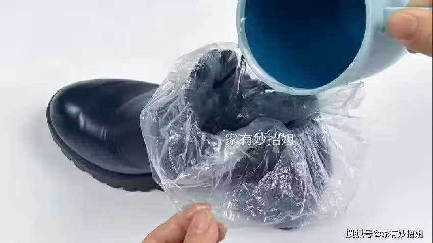 將塑料袋塞到鞋子裡,然後再往塑料袋裡倒入清水,不要倒的太多,只要確保鞋子前方擠腳的位置都充滿水就可以了。