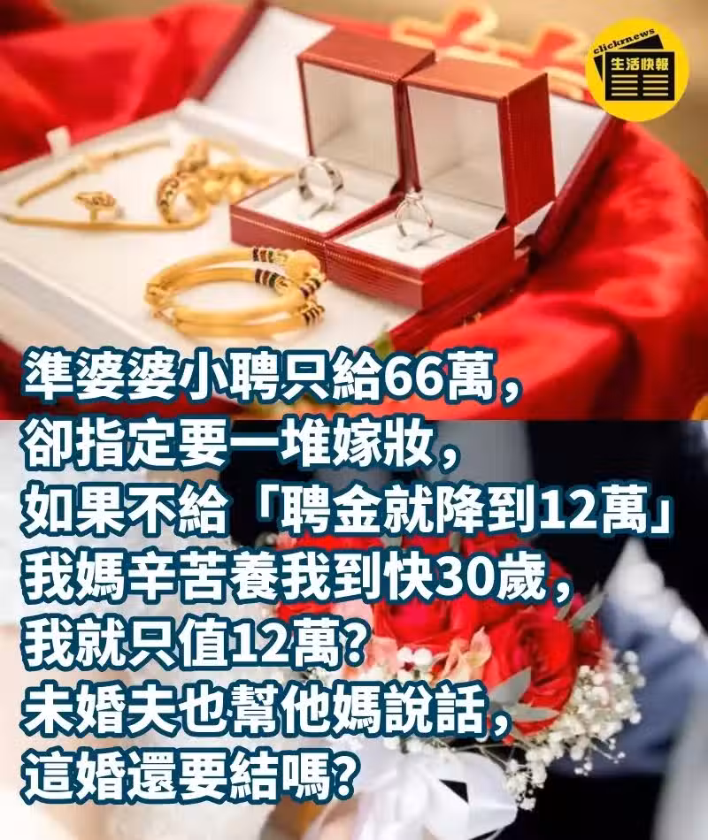 准婆婆小聘只給66萬,卻指定要一堆嫁妝,如果不給「聘金就降到12萬」,我媽辛苦養我到快30歲,我就只值12萬?未婚夫也幫他媽說話,這婚還要結嗎?