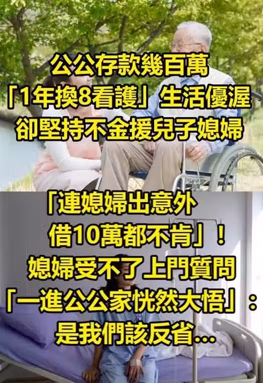 公公存款幾百萬「1年換8看護」生活優渥,卻堅持不金援兒子媳婦,「連媳婦出意外借10萬都不肯」! 媳婦受不了上門質問「一進公公家恍然大悟」:是我們該反省…