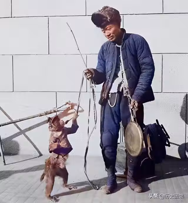 在上海街頭,一名猴戲藝人正在表演節目。他一手拎著銅鑼,另一隻手牽著猴子。他不斷發出口令,猴子就能做出相應的動作。再加上小猴子戴著帽子,穿著小馬甲,舉手投足令人忍俊不禁。現在,會猴戲的人越來越少了,而猴戲也是非物質文化遺產。