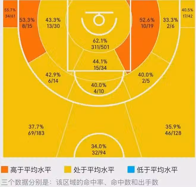 對比一下馬爾卡寧2022-23賽季的投籃熱區,沒有一個區域低於聯盟平均水平,籃下命中率高達62.1%。簽下大合同之後,馬爾卡寧在場上無欲無求,本賽季多項數據出現明顯下滑,根本配不上近5000萬美元的年薪。