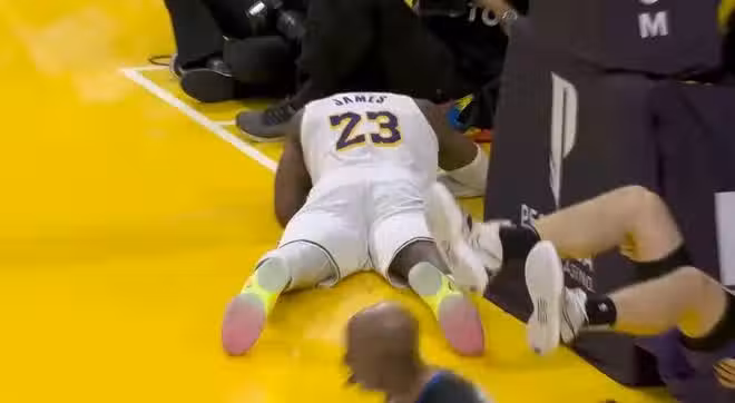 詹姆斯當時非常痛苦,捂著自己的臉在底線附近掙扎著,狠狠的拍地板,看著都知道有多疼,半天都沒起來。而且這個球當時裁判沒有吹任何的犯規,就看著詹姆斯在底線掙扎也沒理他,珀爾特爾起身非常開心的回去防守去了,勒布朗在地上趴了半天,但還是選擇了咬牙堅持。