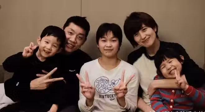 許昕和妻子姚彥帶著一兒一女和全紅嬋合影留念,全紅嬋C位,許昕抱著兒子,姚彥抱著女兒,有網友調侃道:爸爸媽媽和三個孩子!
