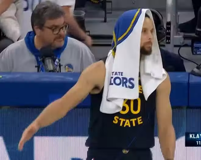 當時庫里披著個毛巾,臉色非常的凝重,明顯是對於球隊對湯普森的防守很不滿意,因為沒有人比他更清楚克萊有多強了,你們怎麼能這樣看湯神打呢?這合適嗎?都知道他是回來證明自己的,這還不好好防,連轟6分,直接把庫里給打呆了。