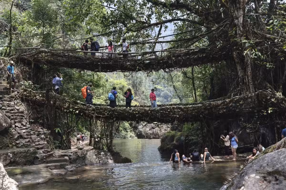 這種奇特的活根橋(Living root bridge)主要分布在印度梅加拉亞邦乞拉朋奇的深山裡,主要是由印度榕(Ficus elastica)的氣根(即暴露於空氣中的根)交纏而成,跨越當地的許多河流和峽谷,是當地村民賴以維生的交通要道。