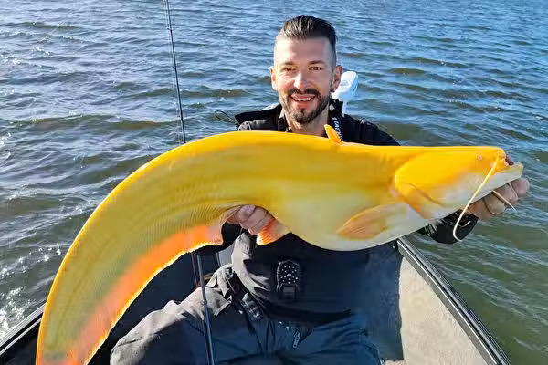 德國漁民釣到罕見金黃大鲶魚 外形酷似香蕉