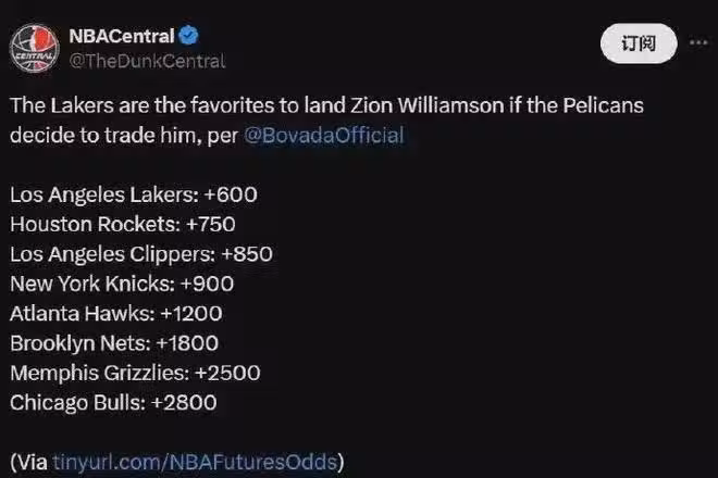 最新博彩網站開出賠率,若胖虎被鵜鶘交易,他的新下家是湖人最被看好,其次火箭,第三快船,具體如下: