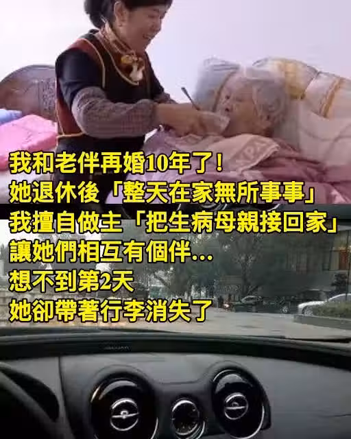 我和老伴再婚10年了!她退休後「整天在家無所事事」 我擅自做主「把生病母親接回家」讓她們相互有個伴;想不到第2天她卻帶著行李消失了
