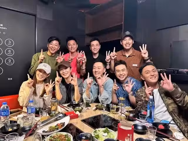 聚會中大家一邊吃一邊聊天,可以說非常開心,而興起時大家更是提議拍照留念,照片中的楊茜堯和林峯坐在c位,顯然他們二人是一群人里發展的最好的,當天楊茜堯戴著棒球帽,穿著深色的休閒外套,雖然只是淡妝出鏡,但是狀態非常好。