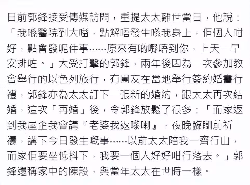 太太去世兩年後,郭鋒有一次參加教會活動前往以色列旅行,看到有團友在當地簽字結婚,郭鋒突然來了興趣,要和亡妻再訂下一紙婚書,認為這是兩人「再婚」。