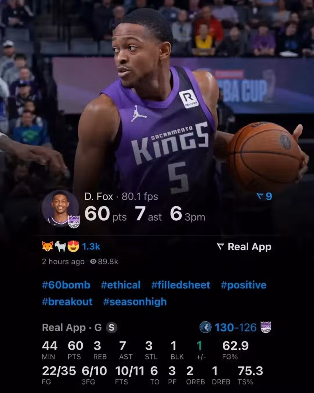 對陣森林狼,福克斯全場出戰44分鐘,投籃35中22,三分10中6,罰球11中10,拿下60分3籃板7助攻3搶斷。