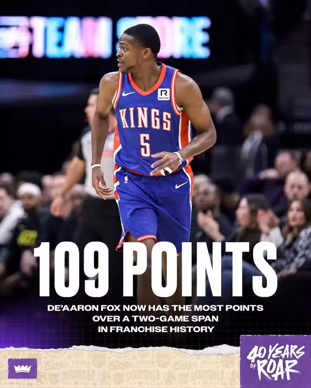如果各位還記得的話,兩年前,也就是22-23賽季,福克斯曾打出生涯最強一季,當時他不僅場均可以拿到25.0分4.2籃板6.1助攻,而且還帶領國王取得48勝西部第三戰績,時隔17年重返季後賽。