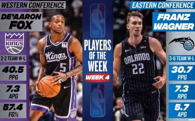 2024年11月19日,NBA官方公布第4周的周最佳球員,國王后衛達龍-福克斯和魔術前鋒弗朗茨-華格納當選。前者在對陣森林狼的比賽中爆砍60分,後又在背靠背中對陣猶他爵士,砍下49分,兩戰合計109分也創造了NBA的記錄,炸裂的得分能力,讓國王隊看到了他們的堅持以及戰略的正確,放棄哈里伯頓和希爾德的信念,終於在此刻得到了回應,但美中不足的卻是國王的戰績不佳,4場比賽中僅僅取得2勝2負的尷尬戰績。相較於此,奧蘭多魔術反倒是給球迷吃了一顆定心丸,球隊在經歷了一波連敗後,終於揚眉吐氣了。