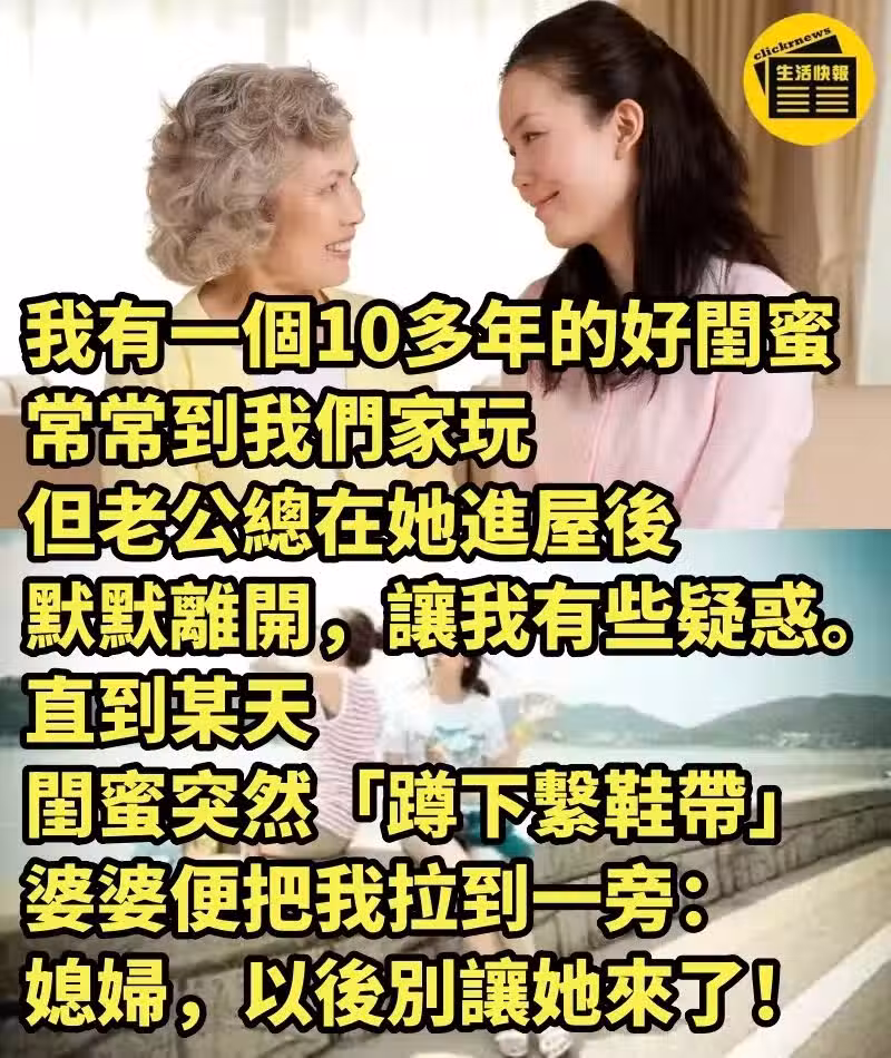 我有一個10多年的好閨蜜,常常到我們家玩,但老公總在她進屋後默默離開,讓我有些疑惑。直到某天,閨蜜突然「蹲下繫鞋帶」,婆婆便把我拉到一旁:「媳婦,以後別讓她來了!」