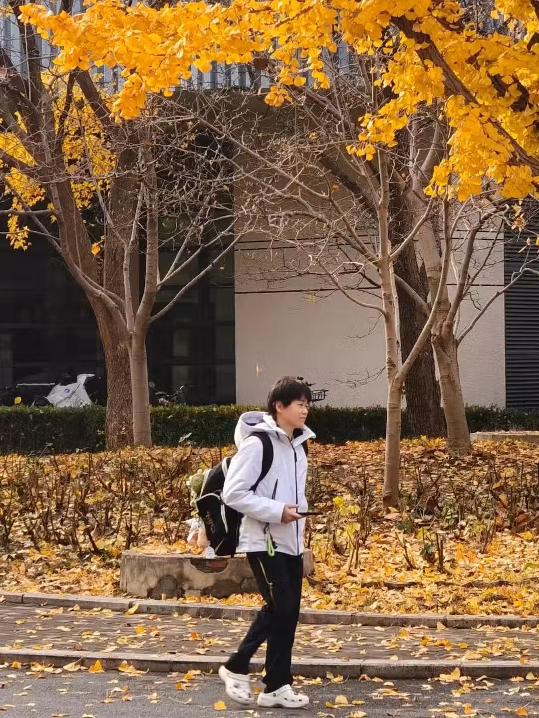 北京的深秋,道路兩旁的銀杏樹落葉紛紛,漫步其中能體會到深秋的意境。全紅嬋穿了厚厚的外套,這段時間北京的氣溫比較低,最冷的時候接近0度了。全紅嬋白色的外套、黑色的長褲。全紅嬋的背包上掛滿了玩偶很是搶鏡。全紅嬋一手拿著手機,慢慢走著,神態比較輕鬆。