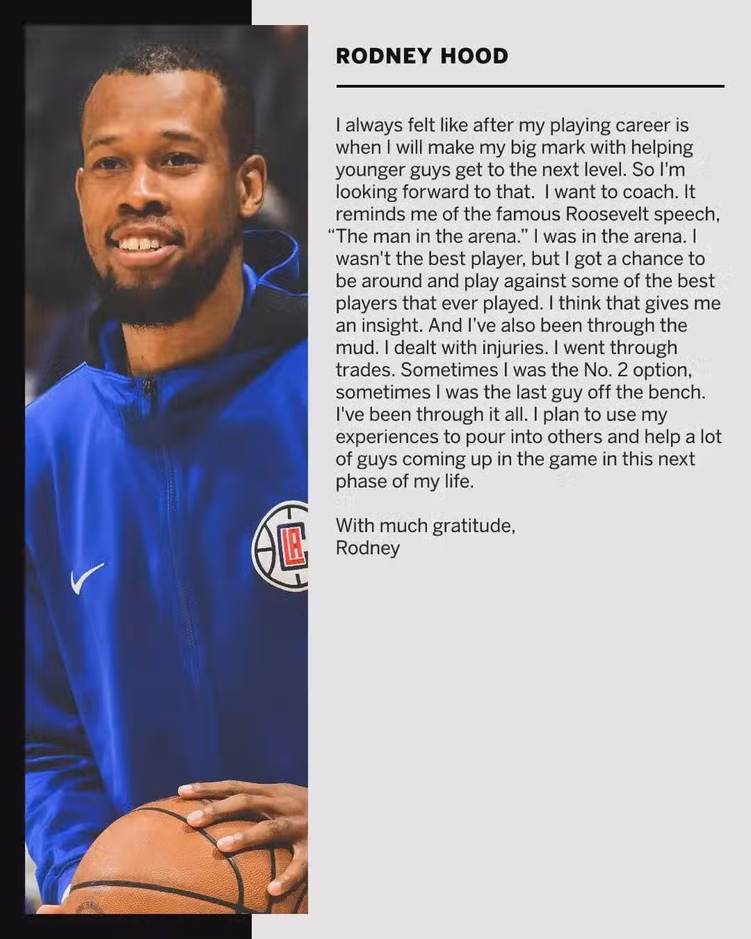 胡德上一次在NBA出戰是2021-22賽季,2022年2月11日,在伊巴卡和巴格利的四隊交易中,胡德被雄鹿送到快船。當季他為快船出戰13場比賽,場均出戰9.6分鐘,僅得到2.6分0.8籃板0.6助攻。2022年夏天,胡德淡出了NBA。