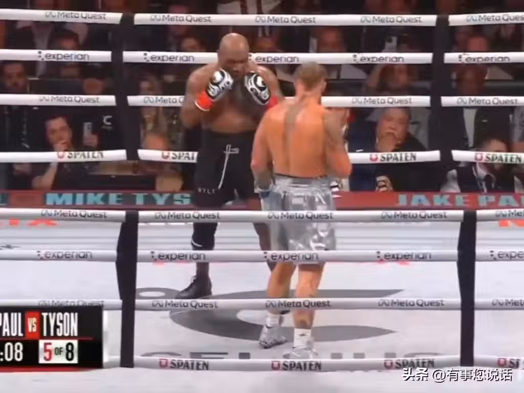 第四回合的時候,泰森主要是防守了,腳步也變慢了,保羅就開始不斷的消耗泰森的體力。