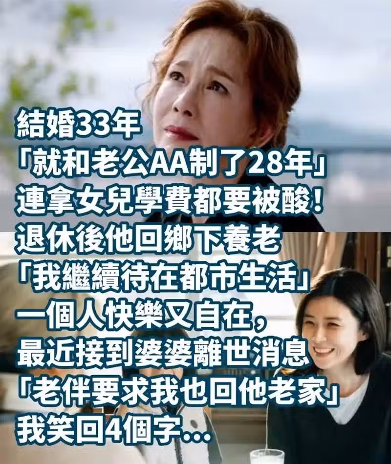 結婚33年「就和老公AA制了28年」連拿女兒學費都要被酸, 退休後他回鄉下養老「我繼續待在都市生活」一個人快樂又自在,最近接到婆婆離世消息「老伴要求我也回他老家」我笑回4個字!