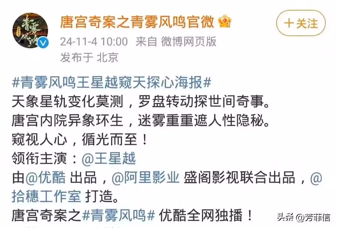 11月4號,古裝劇《唐宮奇案之青霧風鳴》官宣了男主王星越。