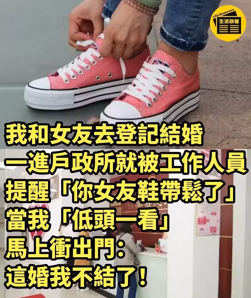 我和女友去登記結婚,一進戶政所就被工作人員提醒「你女友鞋帶鬆了」,當我「低頭一看」馬上衝出門:這婚我不結了!