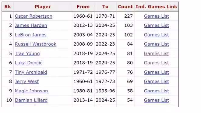 這項統計的歷史第一是羅伯特森,他227次達成,哈登和他差了太多,應該沒有希望挑戰該記錄了。在當今NBA年輕人中,特雷楊、東契奇30分10助攻次數非常多,特雷楊目前81次達成,東契奇目前80次達成,特雷楊排名歷史第五,東契奇排名歷史第六,他倆未來有希望在這個統計上超過哈登,甚至有希望衝擊羅伯特森的歷史紀錄,畢竟特雷楊才26歲,東契奇才25歲。