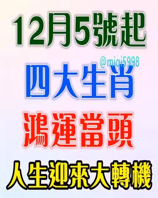 朋友們,你們是否曾經幻想過,某天早晨醒來,世界突然變得五彩斑斕,所有的努力都有了回報,好運像磁鐵一樣吸附在身邊?告訴你,這不是夢!特別是對這四個生肖的朋友來說,12月5日開始,你們的生活將發生翻天覆地的變化,準備好迎接這波讓人眼紅的運勢大潮了嗎?