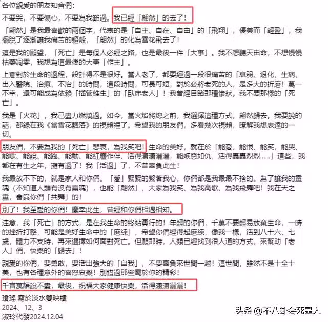 即便瓊瑤也暗示了自己不想經過痛苦的生病、絕望等待死亡的過程,可這短短的一篇文字,仍未讓人感到過多的悲傷,反倒能理解她作為86歲老人對待死亡的決絕。