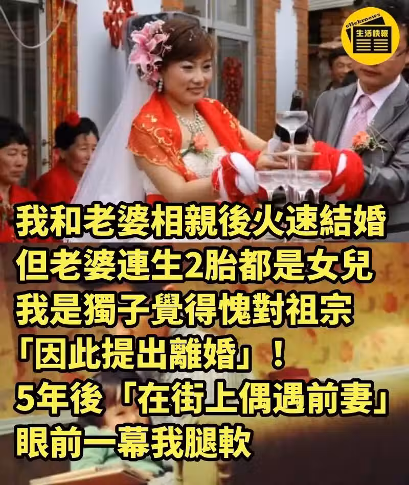 我和老婆相親後火速結婚,但老婆連生2胎都是女兒,我是獨子覺得愧對祖宗「因此提出離婚」!5年後「在街上偶遇前妻」眼前一幕我腿軟