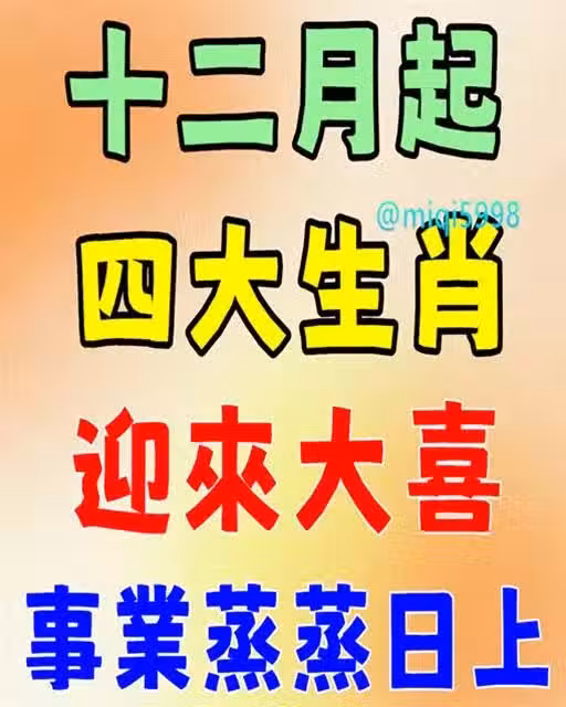 在這個寒風漸起的12月,我們都在期待著那一抹溫暖的陽光,期待著生活的每一個小確幸。今天,小小要帶來一個好消息,12月將有四個生肖迎來大喜,他們財源廣進,事業節節高升,家庭幸福美滿!是的,你沒有聽錯,就是這四個生肖,他們將在接下來的日子裡,用實力詮釋什麼是「人生贏家」。讓我們一起來看看他們是如何在12月綻放光彩的吧!