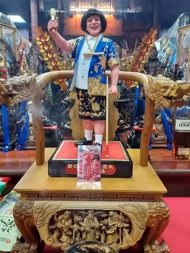 根據《三立新聞》報導,原PO在臉書社團《爆料公社公開版》中貼出照片,只見這間位在桃園龜山的「天母宮天妃廟」裡頭供奉著一尊神明,不只有著馬桶蓋頭、右手還握著一隻金色麥克風,同時配上西裝短褲、白短襪加上黑皮鞋,一眼看過去都會直接聯想到曾經的演藝圈大哥「豬哥亮」,神奇的畫面也讓原PO發文直呼:「這是豬哥仙?
