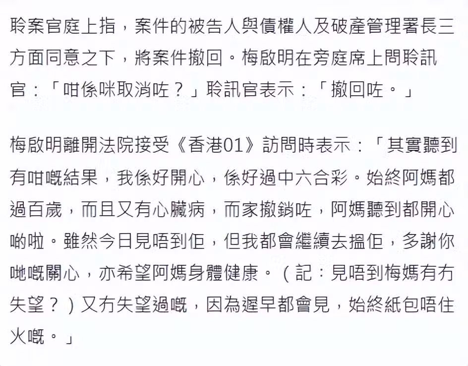梅啟明當天一直不肯離開法院,直到從記者口中得知破產申請被撤銷才鬆了一口氣,表示很開心,比中彩票還開心,坦言媽媽有心臟病不能受刺激,她應該也會開心。