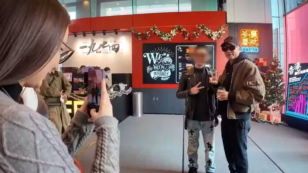 照片可見,頭戴黑色cap帽、一身黑色運動裝束配軍綠色風襤的任達華手執咖啡,在廉政公署ICAC的燈牌前與網民合照,另一張照片更見到任達華蹲在聖誕樹及一塊寫有「香港勝在有你同ICAC」的布景板前舉起手指公拍照。