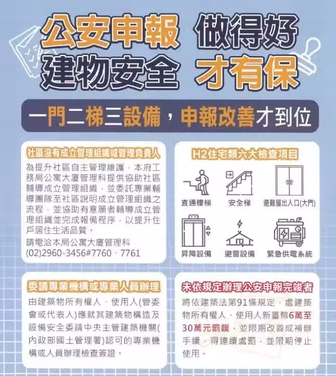 根據國土署的公告,住宅公共安全的檢查項目主要包括直通樓梯、安全梯、避難層出入口、升降設備、避雷設備與緊急供電系統等設施。