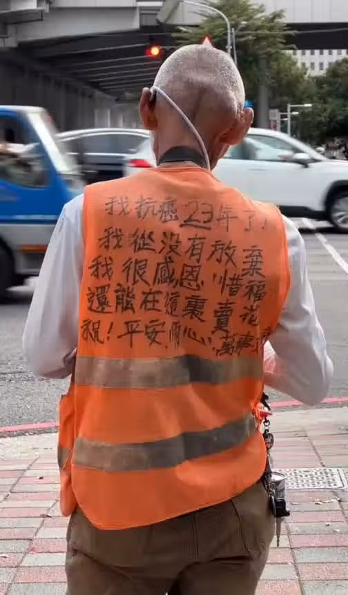 最近,一張照片在社群媒體上引起了熱議,讓許多人感動不已。照片中的爺爺,儘管身體虛弱,還是堅持站在馬路旁賣花,只為了維持生計。爺爺的背心上寫著:「我抗癌23年了!我從來沒有放棄,我很感恩、惜福,還能在這裡賣花,祝平安順心、萬事如意。」