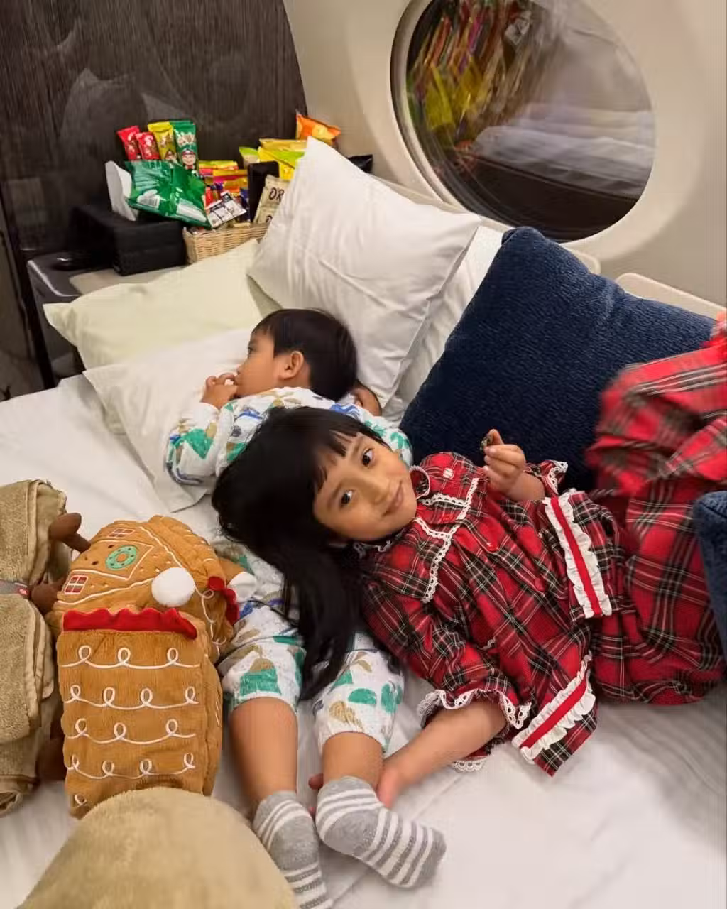 從分享的圖片所見,陳雪鈴和老公以及一對子女置身豪華私人飛機機艙之中,穿上全套白色休閒服的她頭架墨鏡摟著愛女,女兒活躍調皮伸舌頭非常幸福,旁邊放著陳雪鈴的名牌包包。之後其女兒踩上真皮飛機座椅上,盡顯精靈一面。