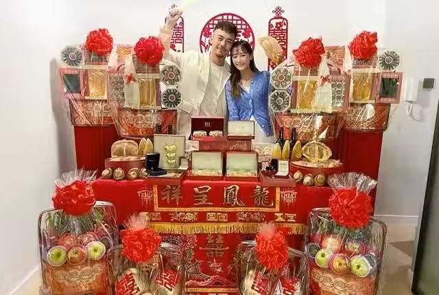 在上個月月底,王虹茵和Pat Wong進行了傳統的過大禮儀式。當時Pat Wong準備了各種金器、吃的、穿的以及用的,禮物鋪滿了整個桌子,看上去非常富貴。