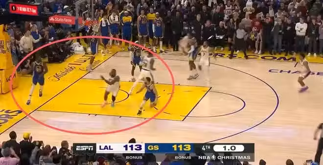 於是庫里往前邁了兩步甩開詹姆斯的時候,時間就剩下0.1秒,他出手時就已經超時了,這球就算是庫里真的超遠三分進了也到點了。此時比賽徹底結束,詹姆斯才終於走到場邊,緊緊摸著里夫斯的腦袋,去鼓勵他和隊友們一起進行慶祝。