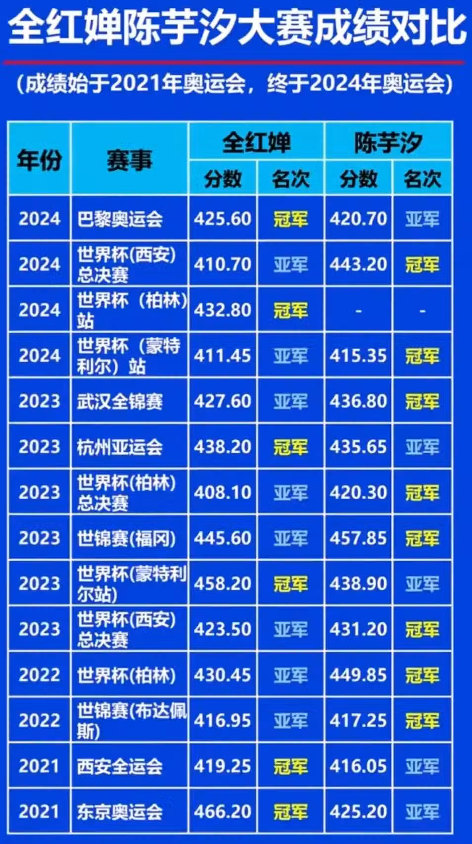 整個巴黎周期,全紅嬋陳芋汐的成績都在400分以上,其中全紅嬋6次超過430分,陳芋汐七次超過430分,這個成績有多可怕,我舉個例子你就知道了。 在2024年9月舉行的全國跳水冠軍賽,四川12歲後起之秀李蕊汐奪得冠軍,她奪冠的分數是358.75分。 全、陳的分數足足領先這個冠軍幾十分,有時甚至領先100分。 這是多麼了不起的成就,這也就是陳芋汐所說的全紅嬋「以一己之力把整個女台的基準線拉倒了430分」的依據。 整個巴黎周期,全紅嬋陳芋汐這對跳水雙子星包攬所有世界大賽冠亞軍(只有世界盃柏林站陳芋汐因身體原因未有參賽例外),為中國跳水隊爭得了榮譽。 全紅嬋陳芋汐之間,永遠都是友誼大過競爭,她們之間從來不是冷冰冰的敵我關係,為個人利益爭得頭破血流。 2024年10月,全紅嬋陳芋汐再次雙雙入選國家隊,我們期待這對跳水雙子星能繼續攜手,奮力拚搏,再次以碾壓性的優勢橫掃整個洛杉磯周期,在洛杉磯再次巔峰對決。 屆時,她們將創造女台嶄新的歷史。