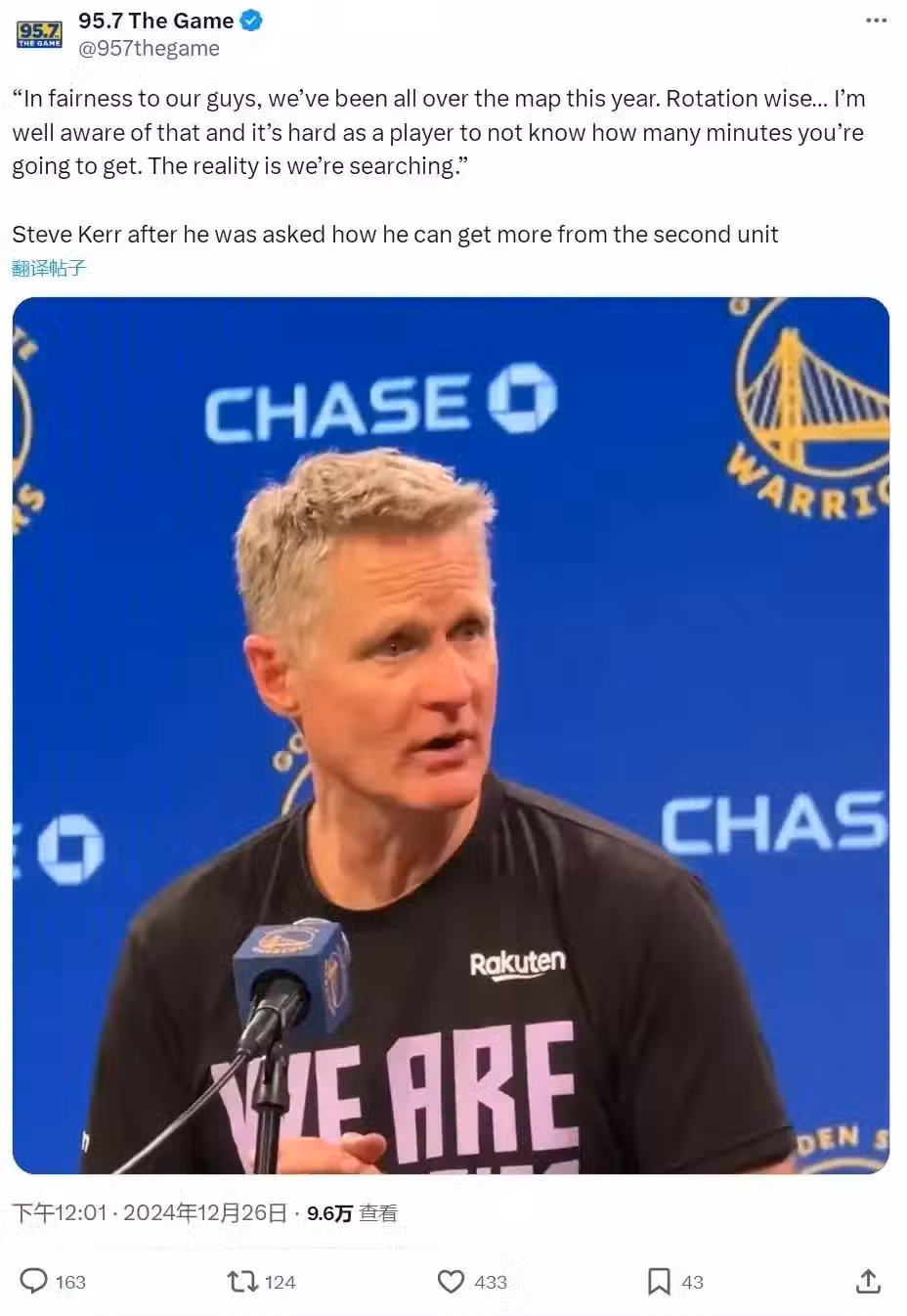 科爾賽後回應:「作為一名NBA球員,不知道自己每場能夠得到多久的上場時間,這確實很難。但現實是,我們還在探索(輪換陣容)。我們現在士氣低落,大家都很失望。」過去14場比賽,勇士3勝11負,場均凈負6.9分!