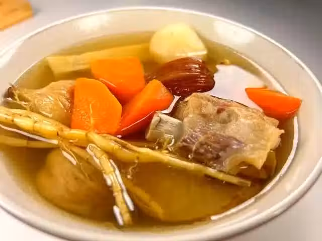 食材:豬骨250克、竹蔗2小節、茅根1小把、馬蹄6個、雪梨乾幾片、無花果、胡蘿蔔1根、蜜棗2顆