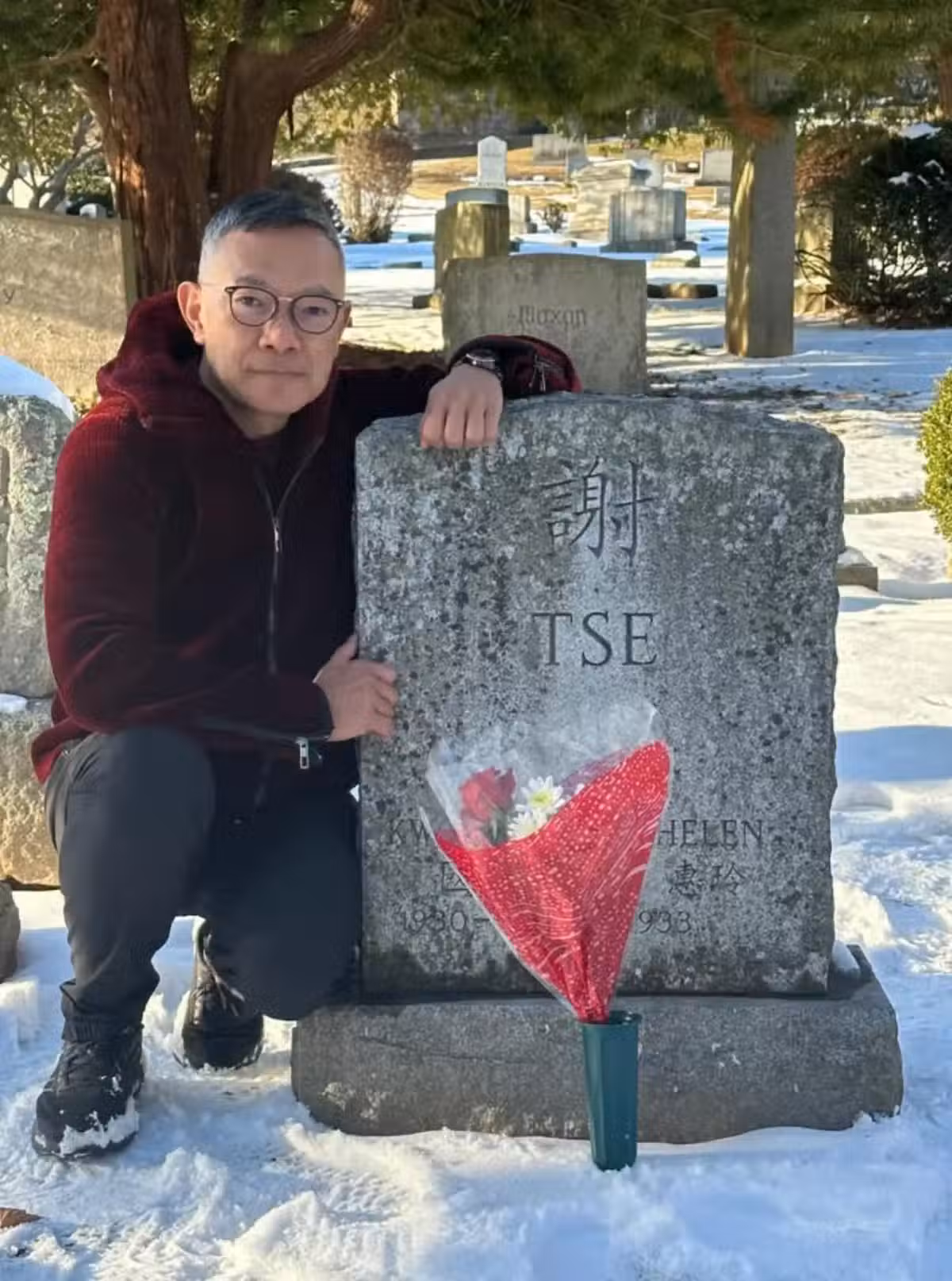 謝偉俊回美國除了與母親相見之外,還順便去當地掃墓,拜祭先人。美國的墓地很簡約,就是在墓園立了一塊石碑,上面以中文寫了「謝」字,沒有署名,說明是謝家的墓碑。謝偉俊也沒有很隆重的儀式感,就在墓碑前擺放了一個小瓶子,上面插了一束鮮花,並且在墓碑前留影。戶外天寒地凍,地上都積滿了雪,但是謝偉俊卻表示,這一趟探親之旅要比任何觀光、美食、購物都來得充實與溫暖。