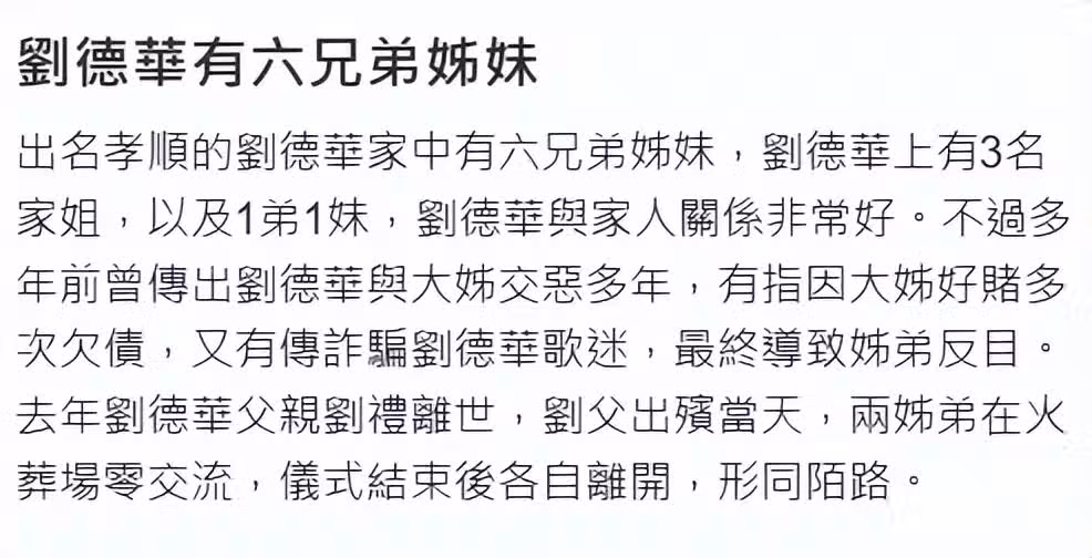 大姐現身觀看劉德華演唱會引發熱議,港媒報道指出,劉德華和大姐交惡多年,原因是大姐好賭成性,不僅拖累劉德華,還曾被曝詐騙劉德華的歌迷,姐弟最終反目成仇,而失去劉德華的資助,她只能住在比較落後的平民房。