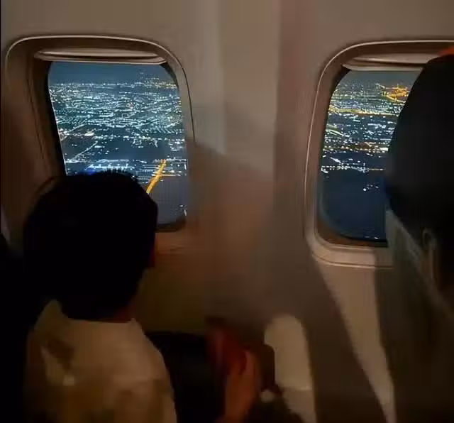 一個男孩坐在機艙內通過窗戶向外張望夜景的畫面,讓無數的網友心碎了。