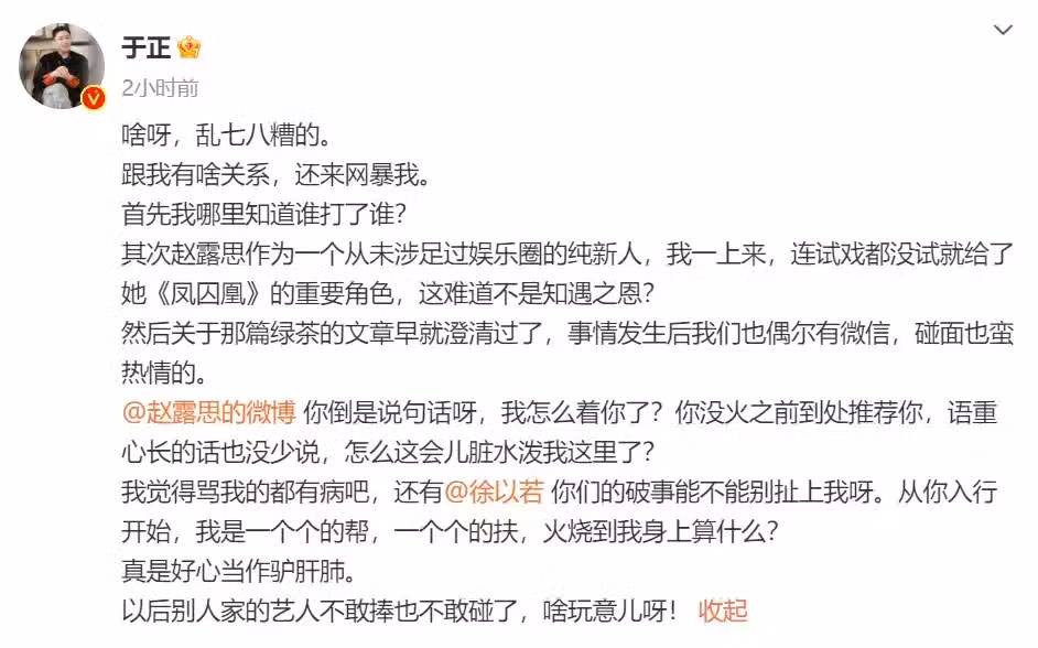 是誰毆打了趙露思?前經紀人否認,於正喊話**
