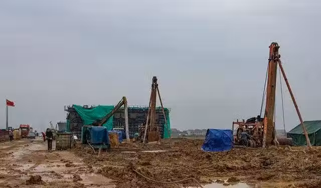 一場大雨下來,工地上被沖的坑坑窪窪,施工工具也被大雨沖的七零八落。