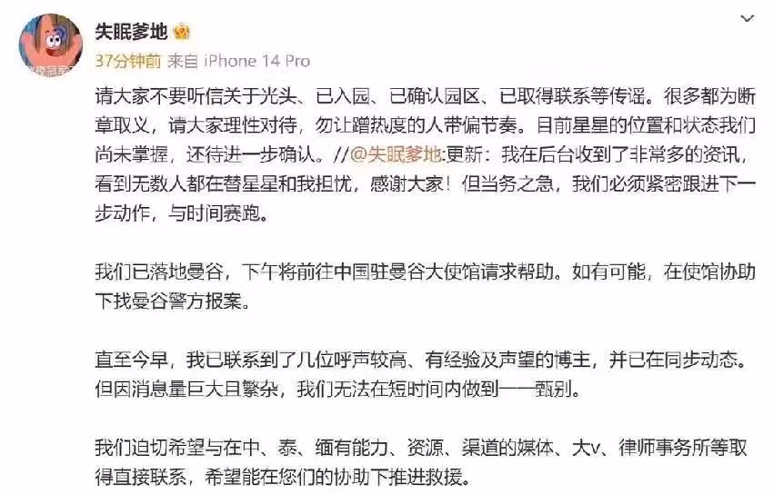 1月7日,泰國文華律所律師告訴封面新聞記者,1月6日,王秦和王星女友已在泰國尋求了大使館和當地警方的幫助,「對於王星目前的情況,還需要跟其親屬溝通後,才能對外發布。