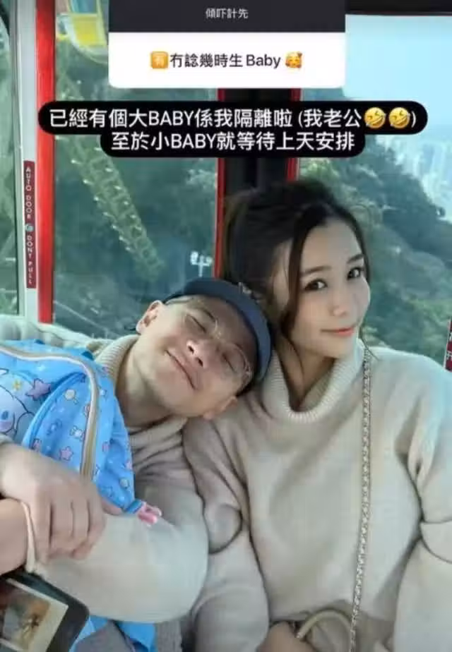 陳詩欣曬出一張與老公坐在纜車中的合照,並表示:已經有大BABY在我身邊啦(我老公),至於小BABY就等待上天安排。