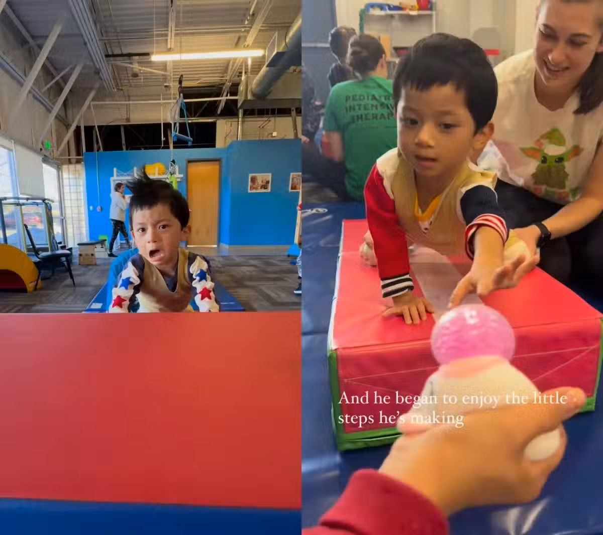 何雁詩表示兒子在治療期間很棒,雖然那三星期的治療很辛苦,但見他已學會爬,每天都有進步很開心:「他在美國每天要治療5小時,因為不知道為什麼要那樣做,天天都哭,我在旁邊看都覺得辛苦,但最後見到他完成得了,我都有感動到哭,他現在已經會爬,短期的希望是他會走,如果可以牽著他一起走路會很開心。」