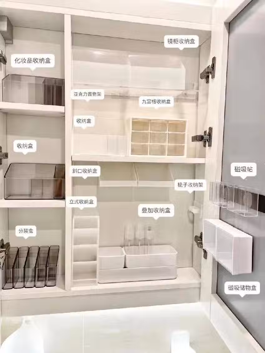 如果衛生間的小物件、化妝品之類的東西太多,可以充分利用好鏡櫃收納。